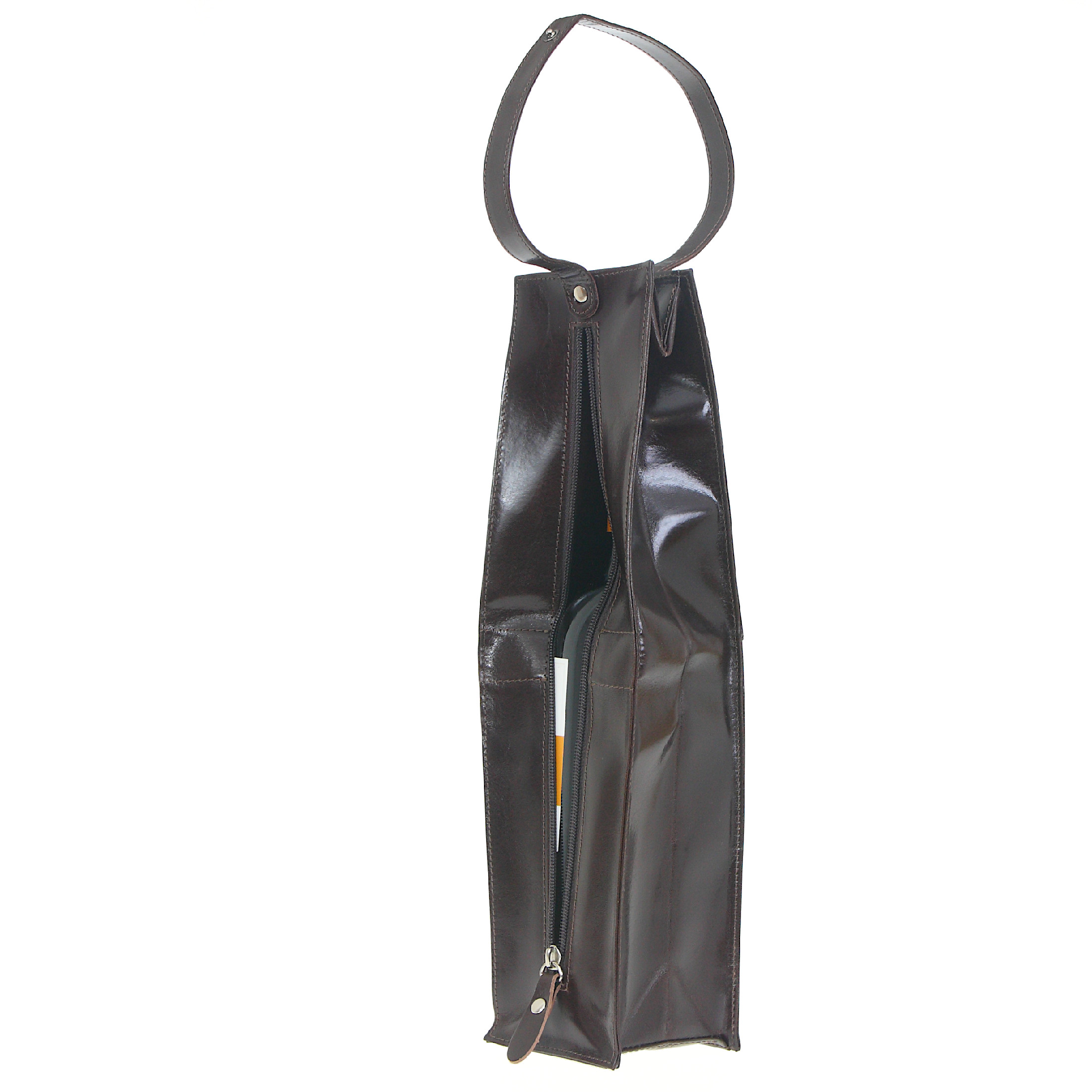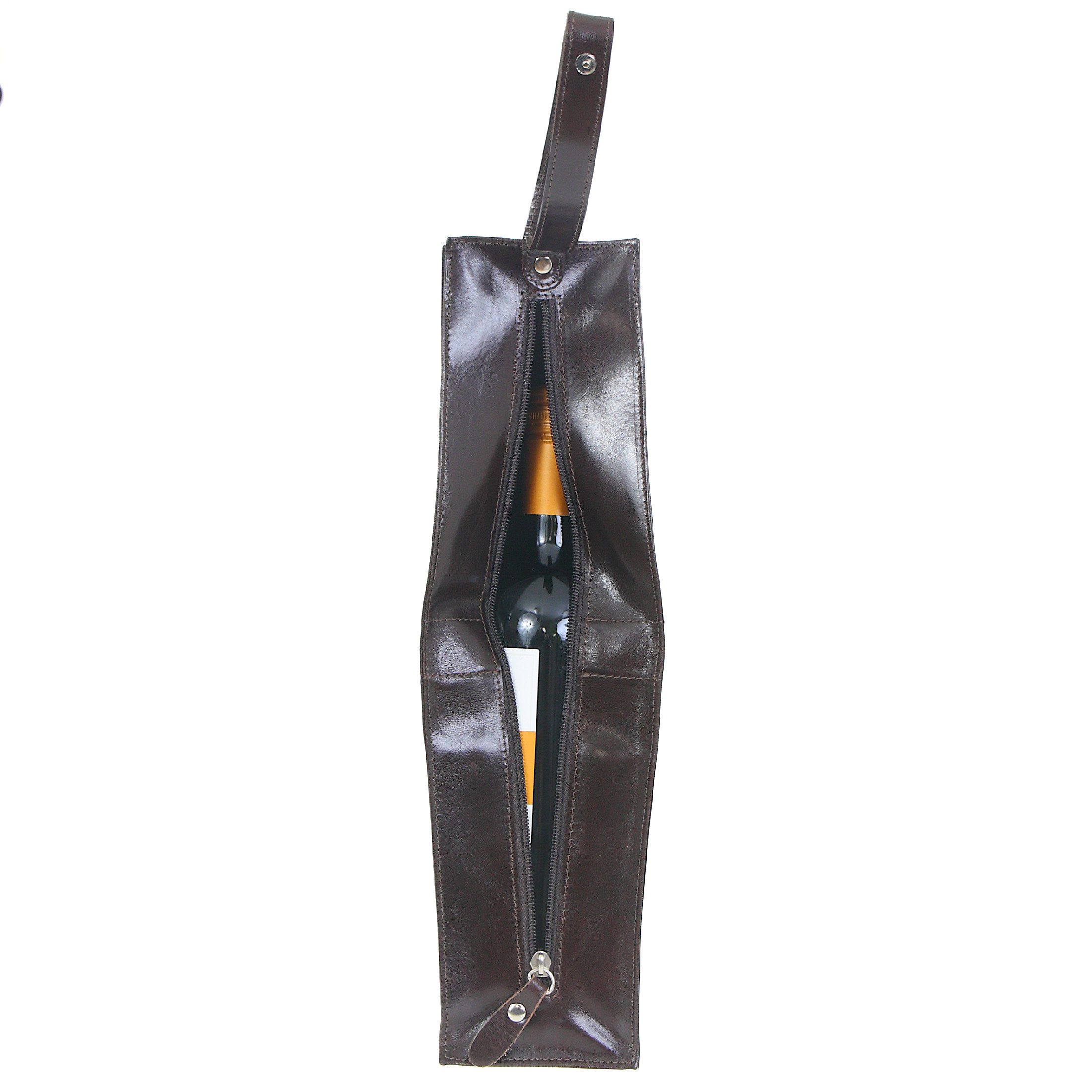 Etui skórzane na butelkę wykwintnego wina. Szlachetna skóra licowa doskonale podkreśli wyjątkowość otulonego trunku. Wnętrze wykończone kolorystycznie dobraną, żakardową podszewką. Skórzany pasek mocowany do korpusu stalowymi nitami zapewnia bezpieczny transport.