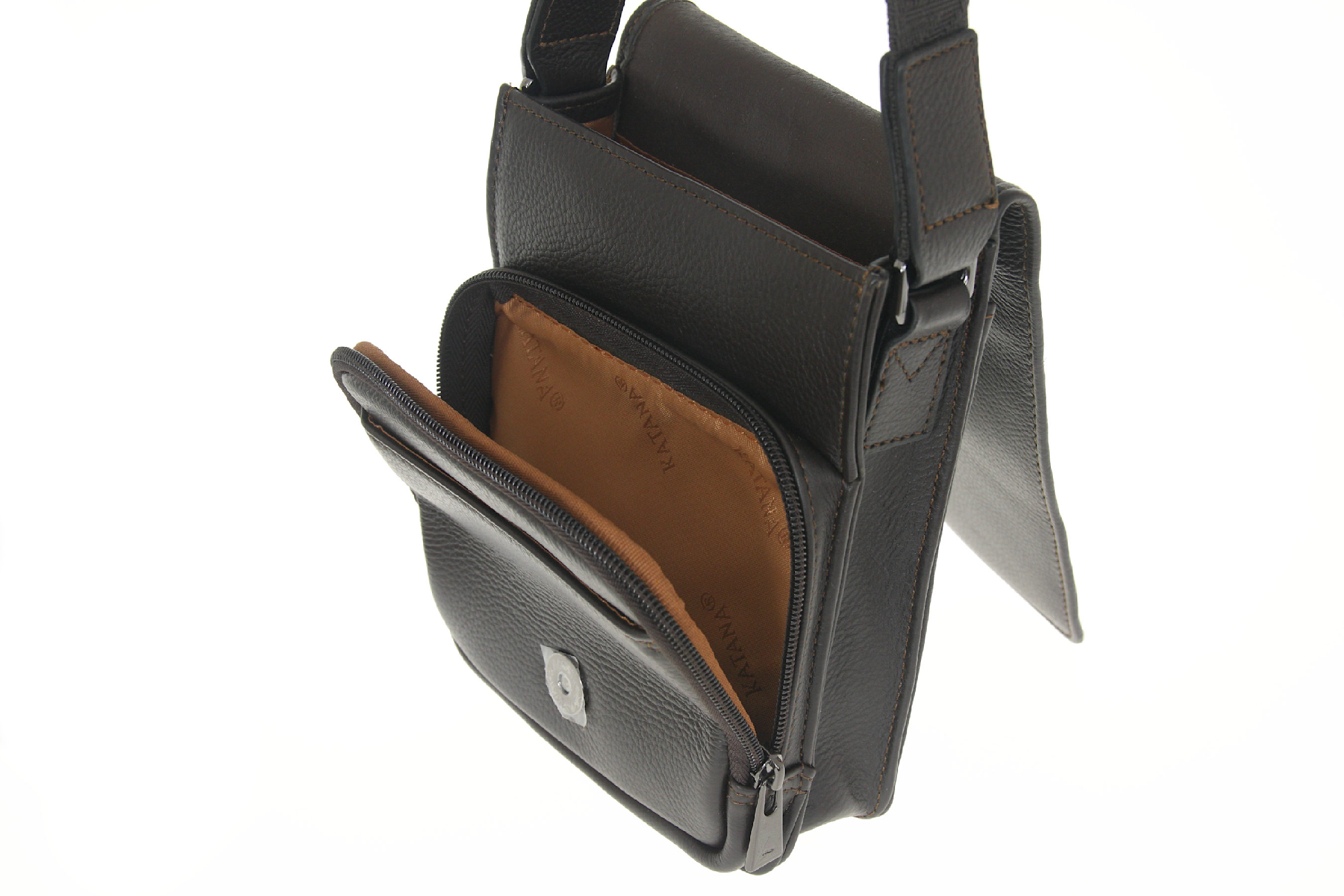 Saszetka do noszenia jak tradycyjna listonoszka. Zamykana klapą na magnesowy zamek. Dzięki dużej ilości kieszeni i przegród z łatwością utrzymasz porządek w zawartości. Wnętrze wykończone ekskluzywną, żakardową podszewką firmy KATANA a podklapa wykończona podszewką skórzaną.
