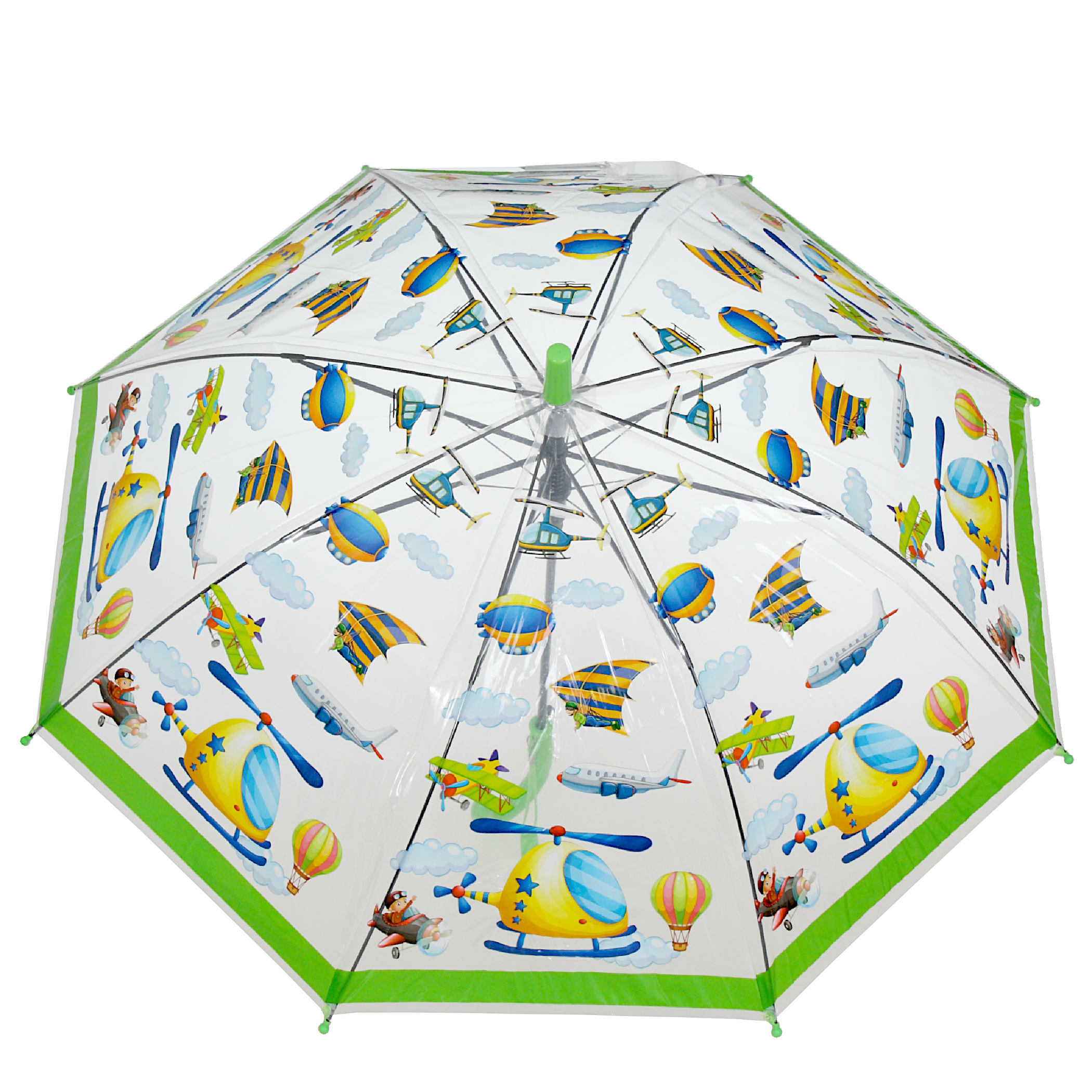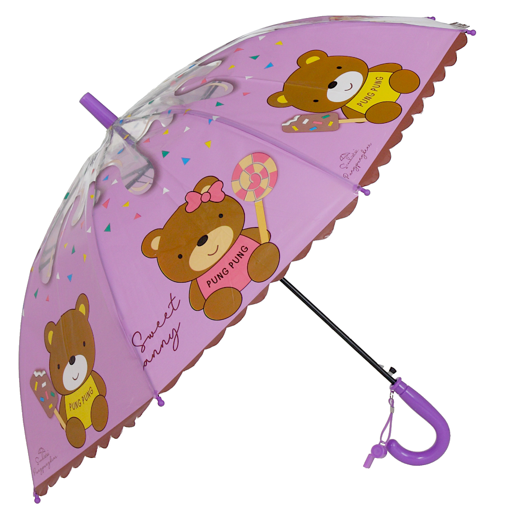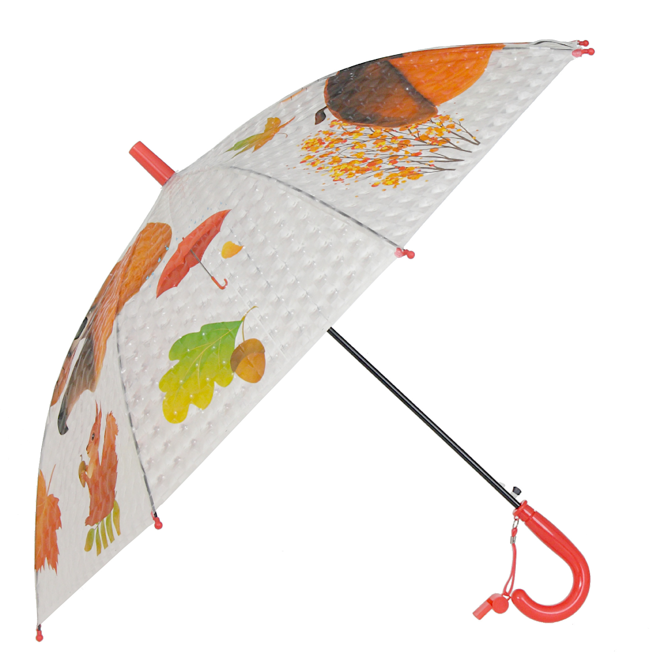 Parasolka dziecięca z bajkowymi postaciami. Automatycznie otwierana. Przeźroczysta czasza wykonana z mocnej, miękkiej folii. Wytrzymały stelaż z tworzywa sztucznego i stali sprężystej. Bezpieczne, pogrubione końcówki stelaża. Rączka plastikowa zapewnia wygodny chwyt dłonią. Dołączony gwizdek w kolorze rączki.