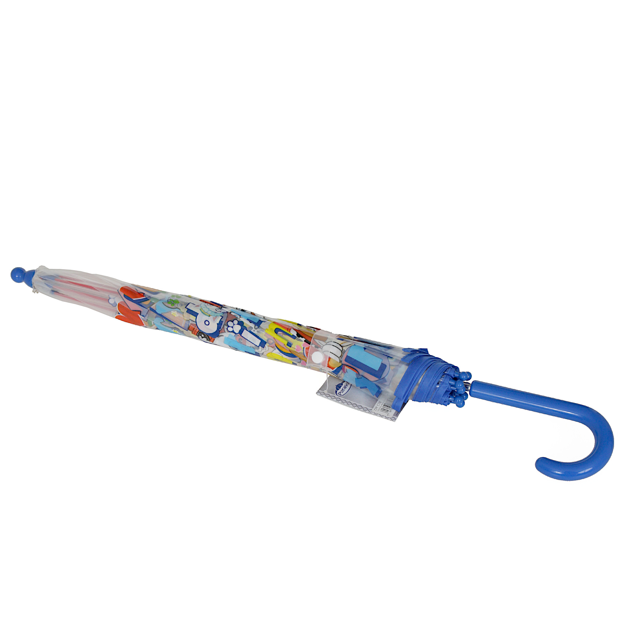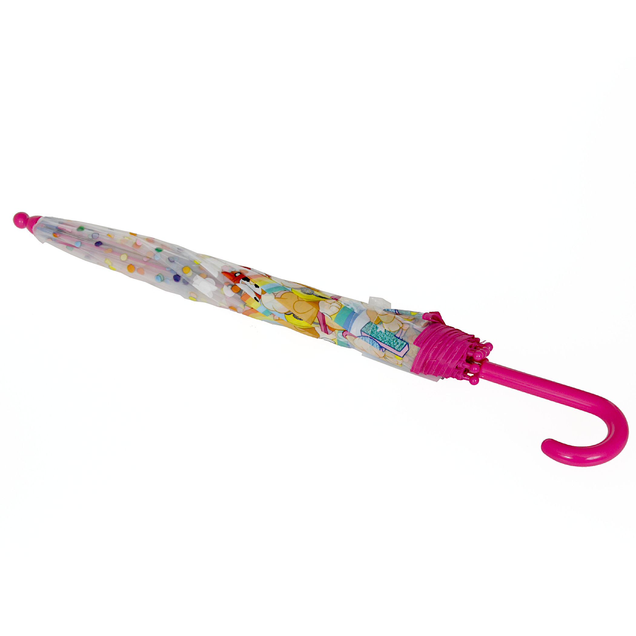 Parasolka dziecięca z postaciami z bajek. Otwieranie i zamykanie manualne. Wytrzymały stelaż ze stali sprężystej i tworzywa sztucznego. Bezpieczne, pogrubione końcówki stelaża. Czasza wykonana z przeźroczystej, miękkiej folii. Rączka plastikowa zapewnia wygodny chwyt dłonią.
