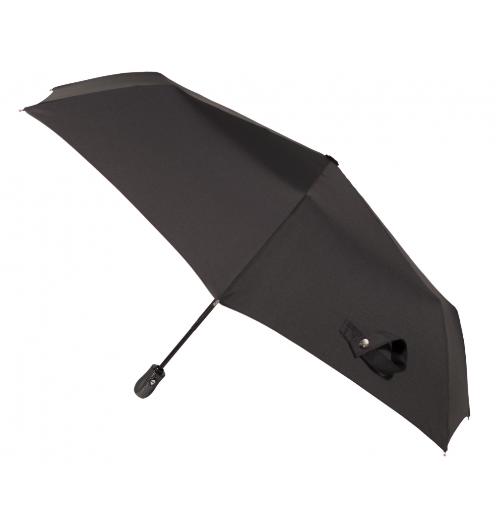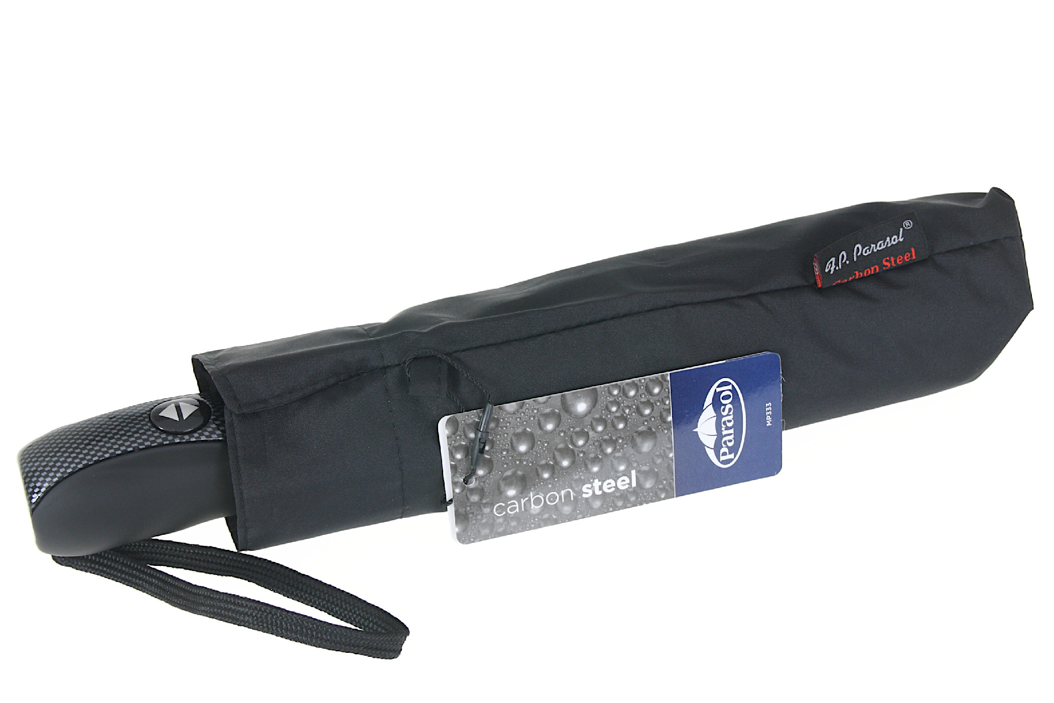 Elegancki parasol męski w kolorze czarnym. Pełny automat czyli rozkładanie i składanie jednym naciśnięciem przycisku. Cecha nie do przecenienia np. przy wsiadaniu do samochodu i w każdej innej sytuacji, gdy mamy jedną rękę zajętą i musimy złożyć parasol.