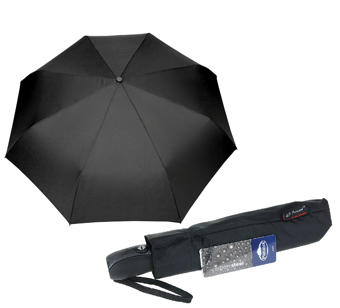 Trzy sekcyjny stelaż i rurka stalowe z elementami z włókien szklanych. Takie rozwiązanie to połączenie niesamowitej trwałości i tylko 29 cm długości po złożeniu. Wykonanie wiatroodporne, czyli ewentualne przegięcie czaszy nie stanowi żadnego problemu, wystarczy sprowadzić ją na swoje miejsce. Poszycie z czarnego poliestru. Rączka plastikowa.