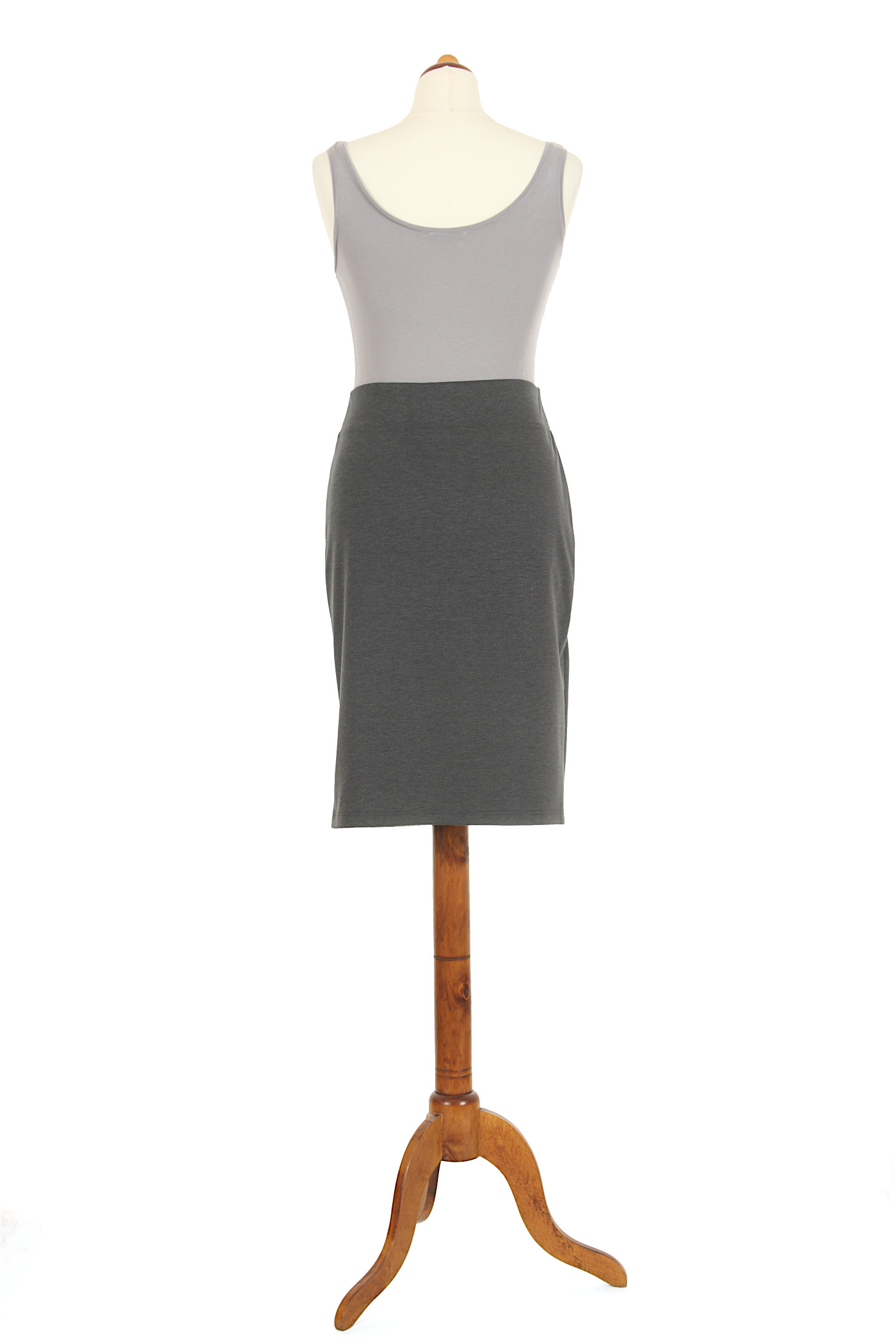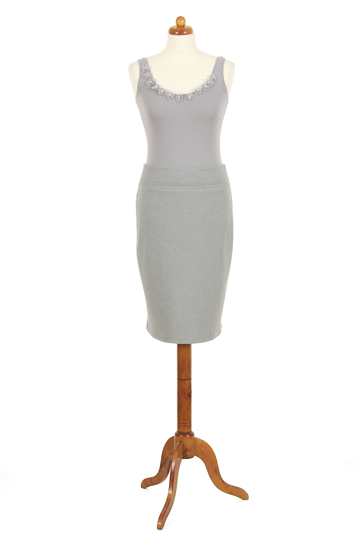 Prosta spódnica o ołówkowym kroju. Jest to ponadczasowy fason, skutecznie opierający się zmianom w trendach. Wykonana jest z rozciągliwego materiału, dzięki czemu nie zastosowano zamka. W pasie wszyta jest niewidoczna guma pozwalająca na wciągnięcie spódnicy. Pięknie dopasowuje się do sylwetki, podkreślając jej kobiece kształty. U dołu doszyta jest delikatna, metalowa ozdoba.