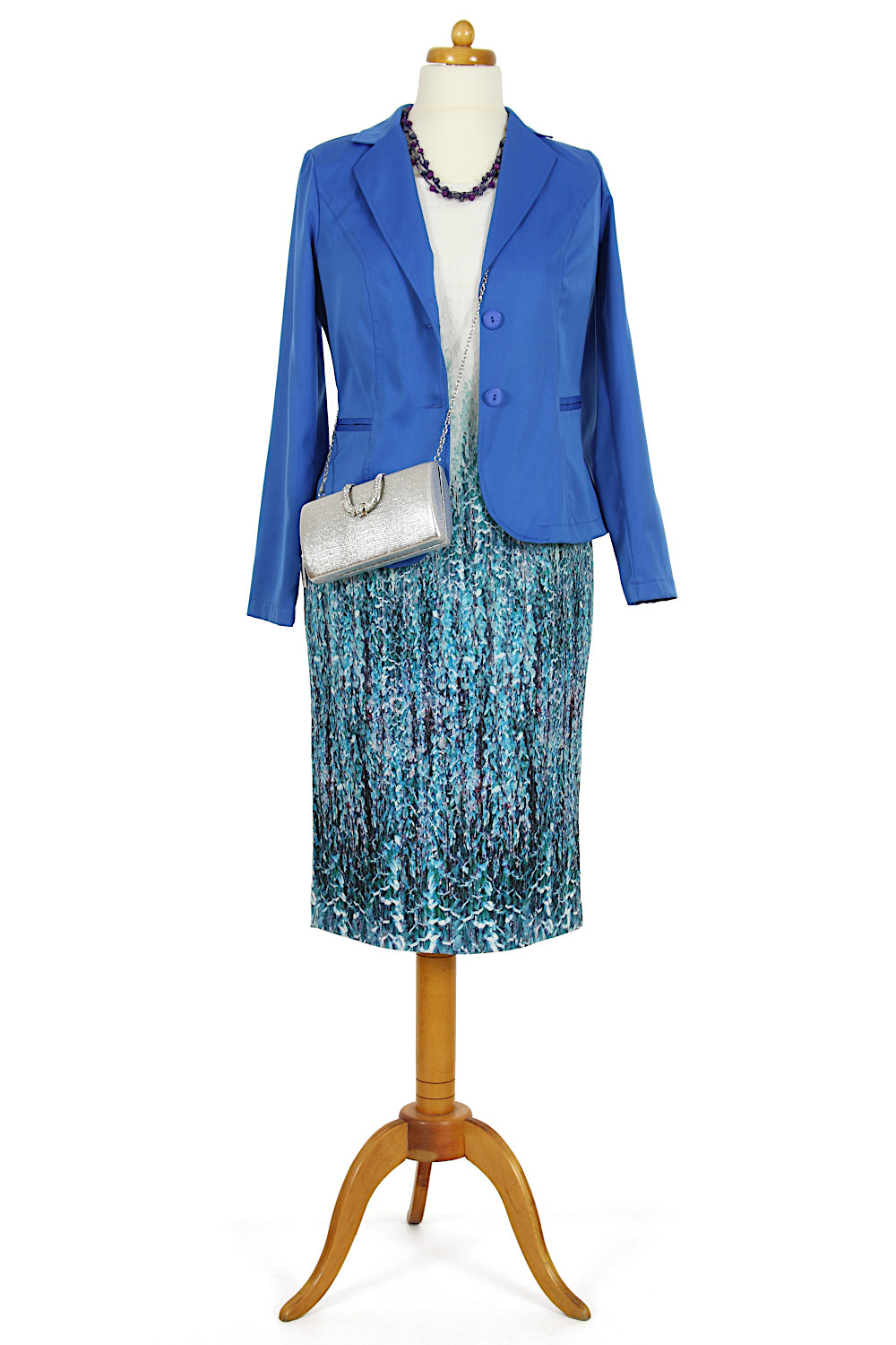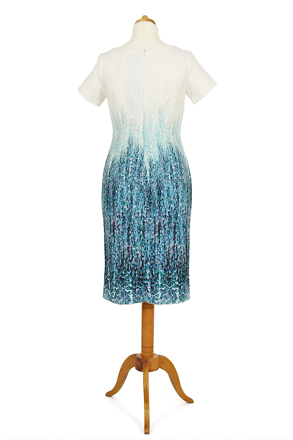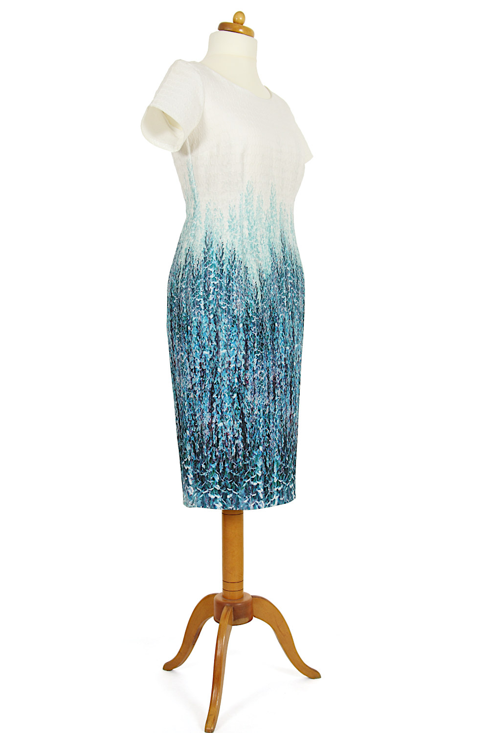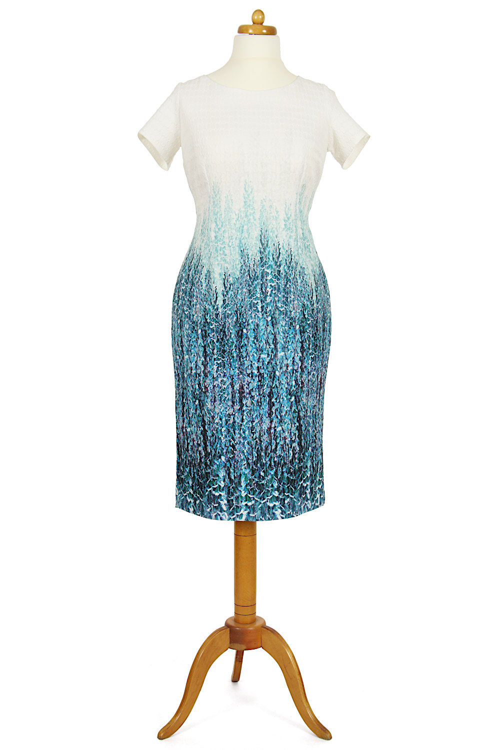 Sukienka prosta, klasyczna, jednocześnie niezwykle atrakcyjna kolorystycznie. Złamana biel w górnej części przechodzi w miętowo-szmaragdowy motyw roślinny na dole. Prezentuje się przepięknie, podkreślając walory kobiecej figury. Okrągły dekolt i krótkie rękawki dodają lekkości. Tył zapinany na długi, kryty zamek. Na dole rozcięcie umożliwiające swobodę chodzenia.