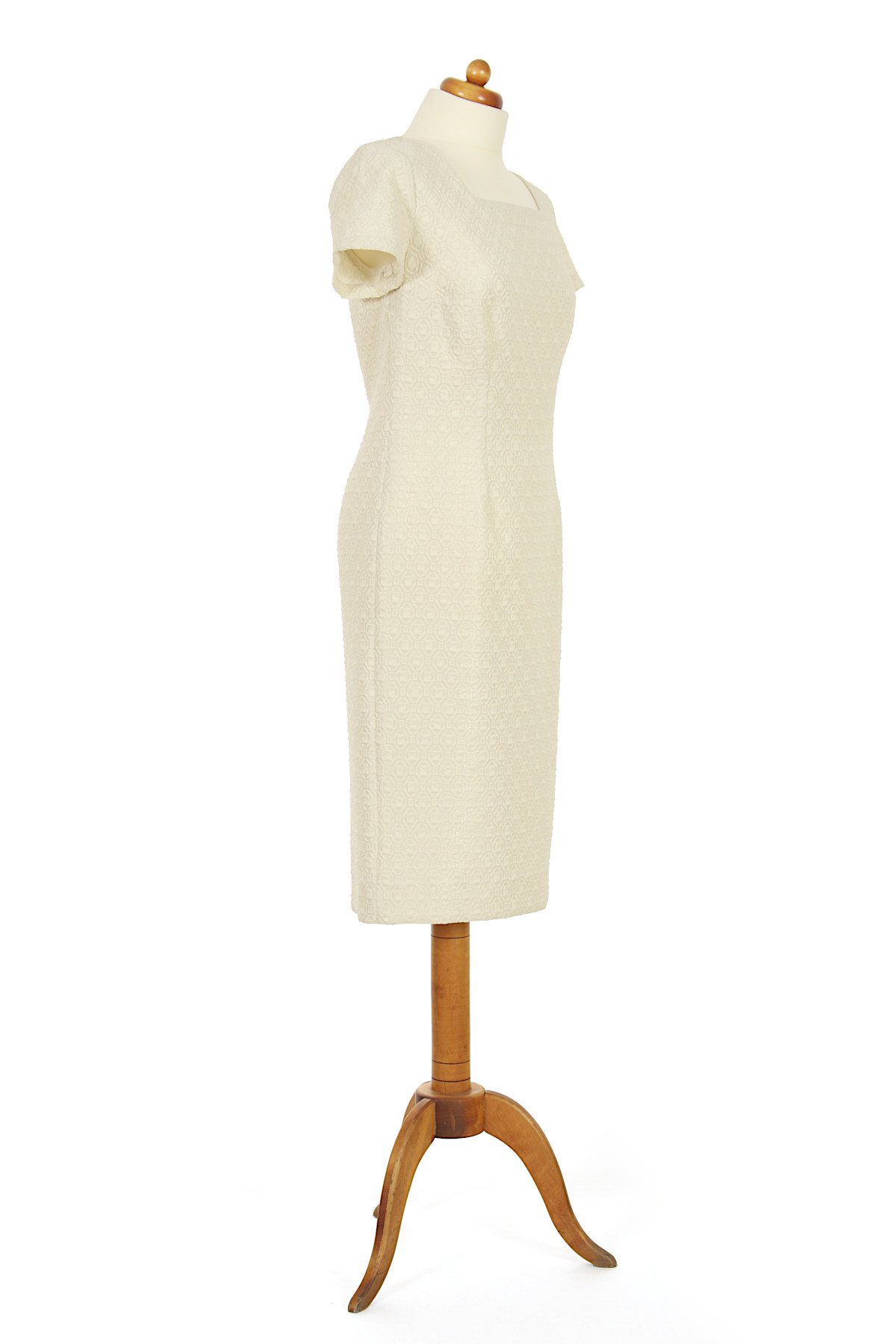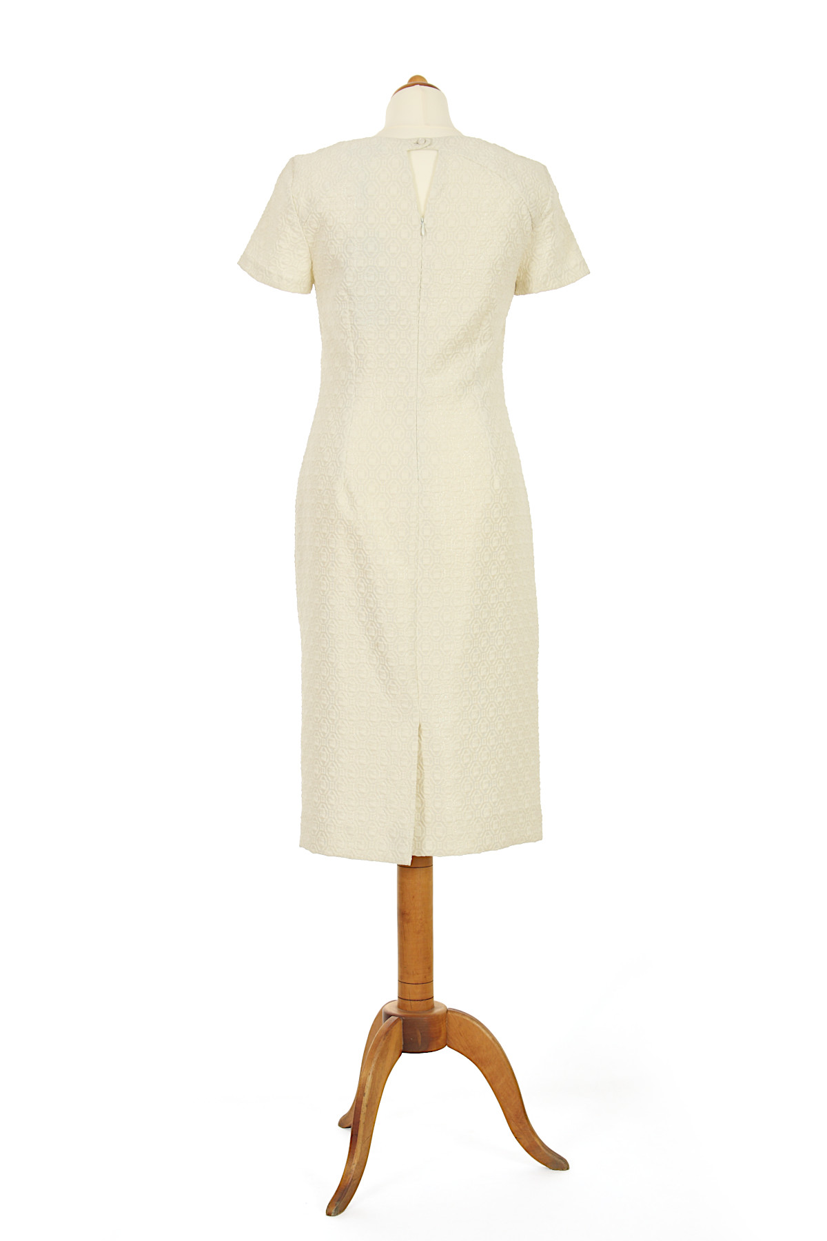 Sukienka elegancka o prostym, klasycznym kroju. Delikatny, wypukły wzór w wysokogatunkowej tkaninie podkreśla jej unikatowość. Dodatkowo, ledwo widoczna, połyskująca nitka wprowadza czar i powab kreacji. Dekolt w kształcie karo również jest niecodzienny. W sukience zastosowano elastyczną, bawełnianą podszewkę zapewniającą wysoki komfort noszenia. Lekkie dopasowanie podkreśla wszelkie atuty kobiecej figury. Jest to wyjątkowo urokliwa sukienka.