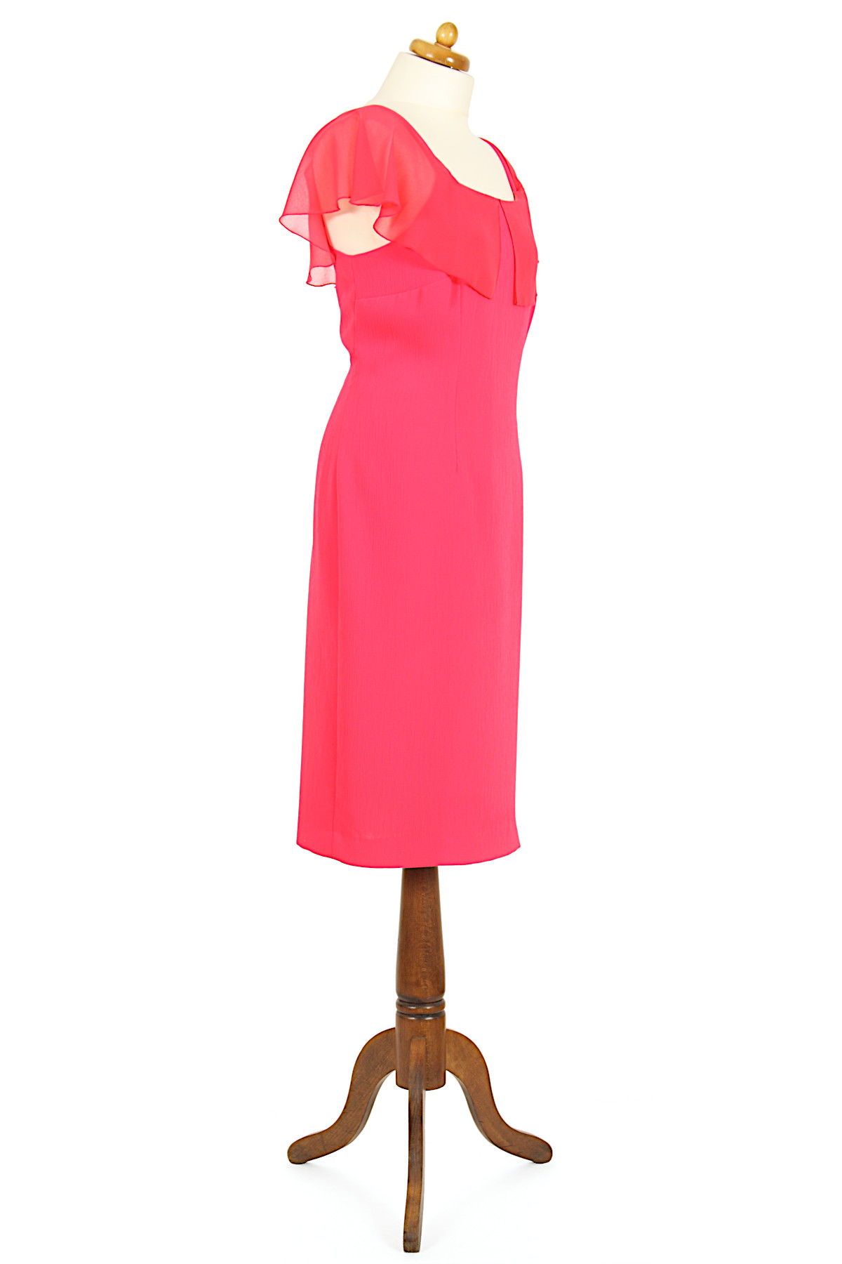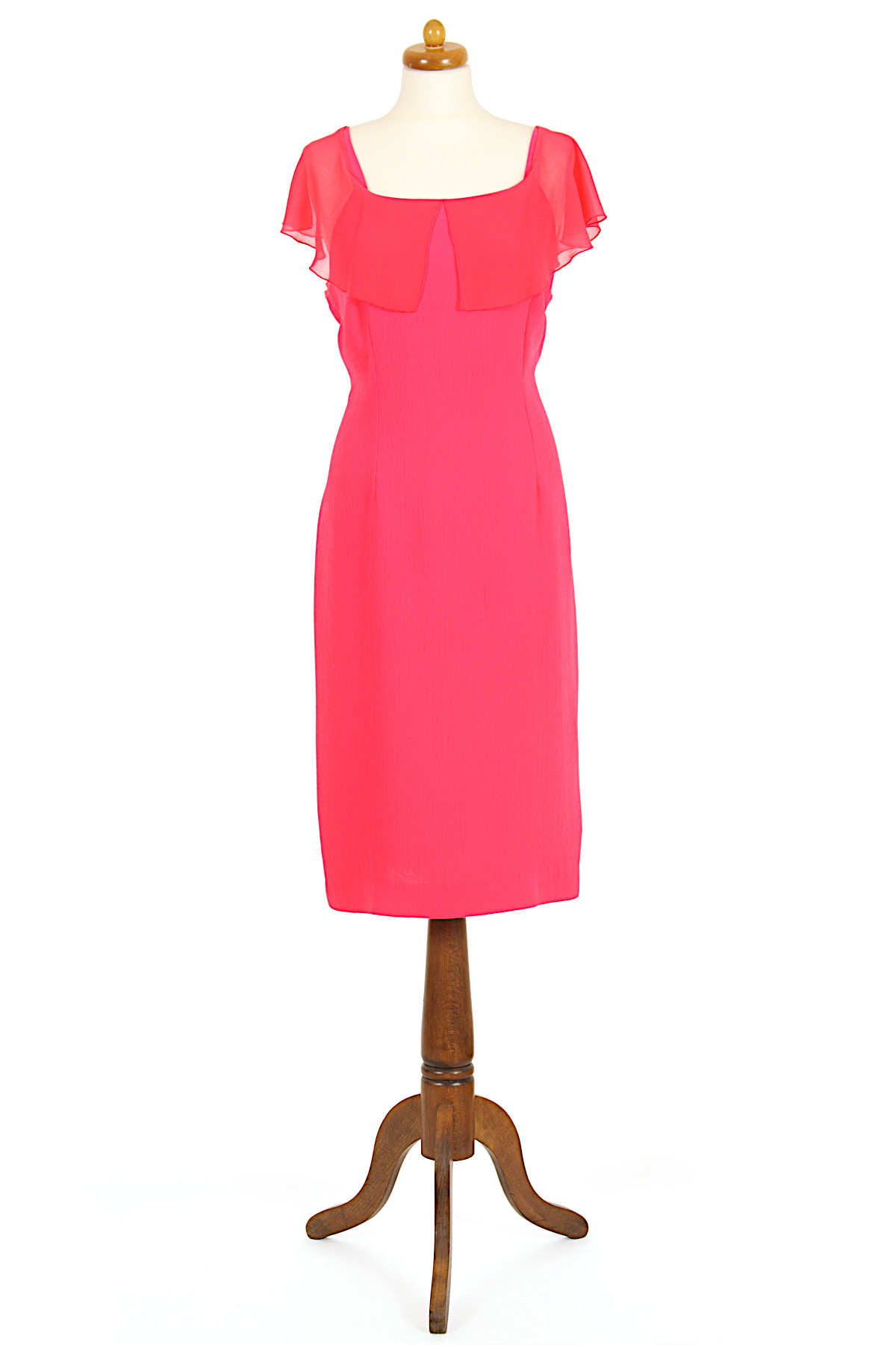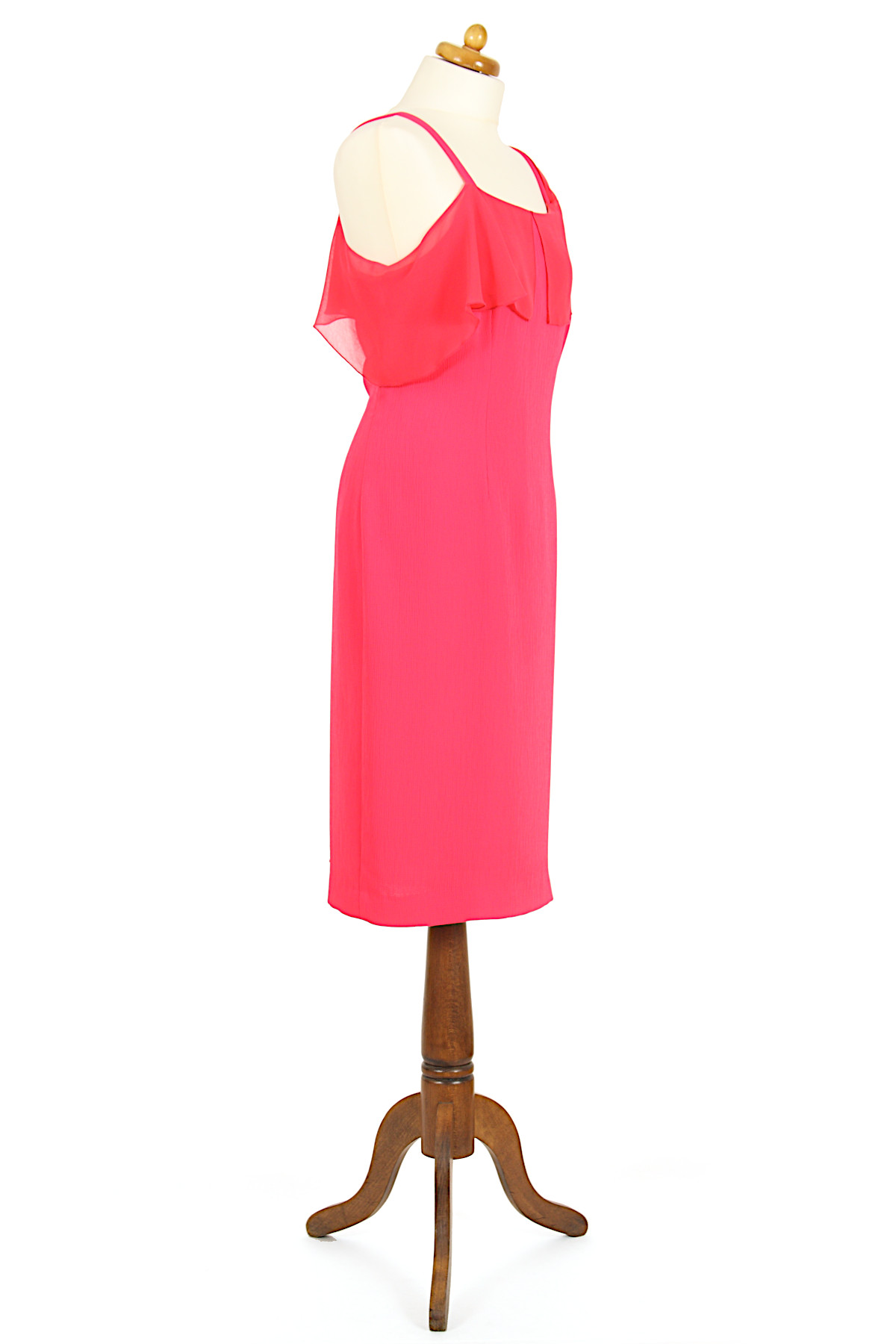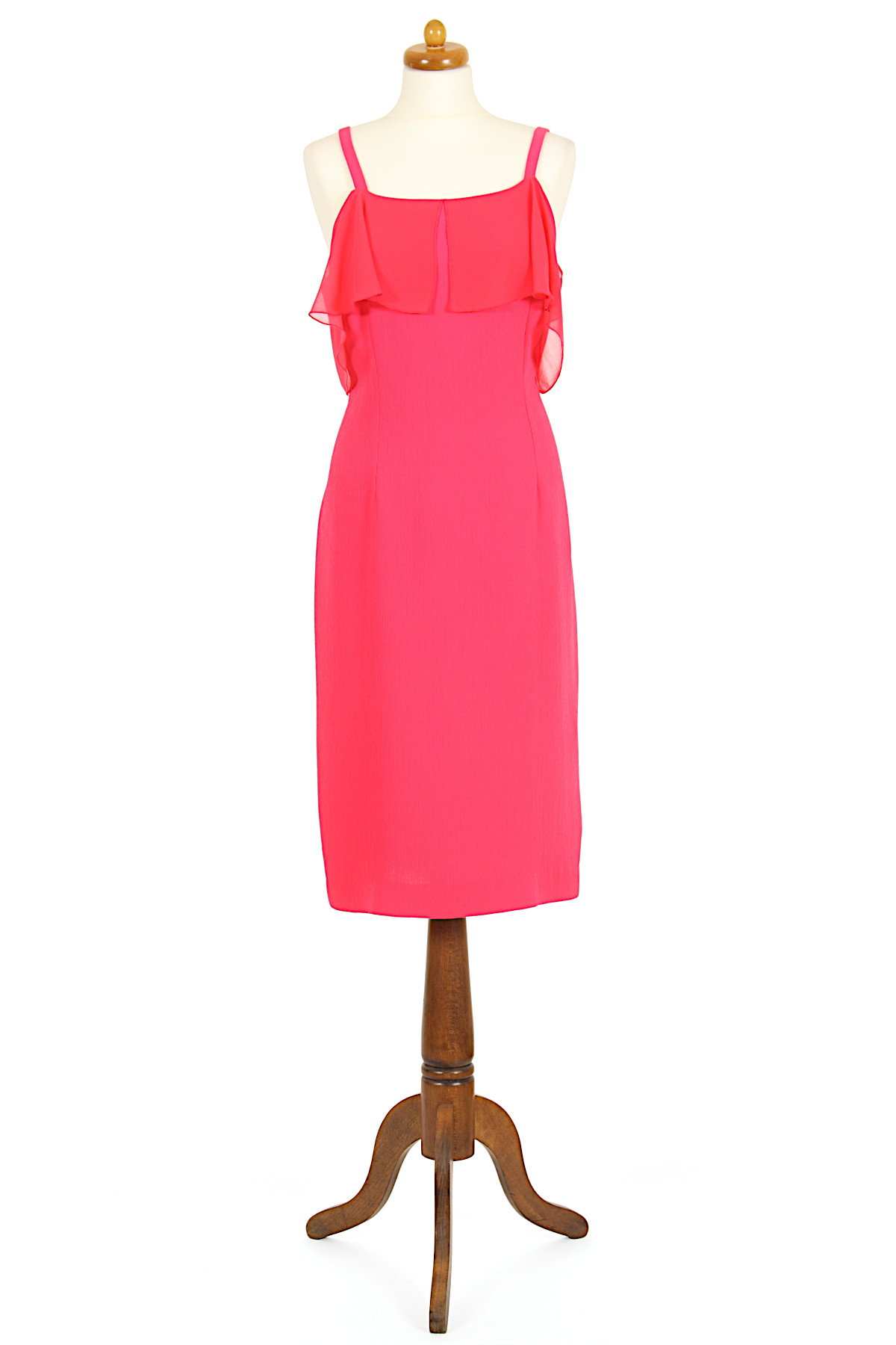 Atrakcyjna wizytowa sukienka w kolorze arbuzowym (malinowa czerwień). Gwarancja udanego spotkania. Nie tylko wyszukany kolor, ale też fason sprawiają, że model ten zasługuje na uznanie. Wysokogatunkowa tkanina jest bardzo delikatna, nadaje sukience lekkość i przewiewność. Do tego cienkie ramiączka i szyfonowa falbanka wokół ramion, to ideał na letnie uroczystości. Falbanka może również służyć jako motylkowe rękawki (patrz zdjęcie). Tył zapinany na długi, kryty zamek. Udogodnieniem swobodnego użytkowania jest na dole 19 cm rozcięcie.