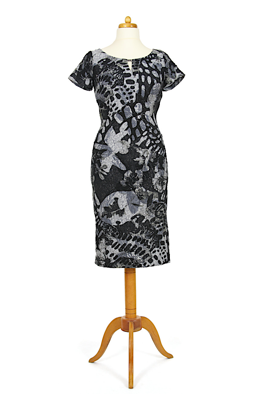 Elegancka sukienka o prostym, klasycznym kroju. Wzór na tkaninie oraz jej wypukła faktura powoduje, że jest to sukienka niezwykle elegancka. Okrągły dekolt ozdobiony jest delikatnym, metalowym detalem współgrającym ze srebrną nitką, którą przetkana jest tkanina. Suknia odszyta jest na elastycznej podszewce, która zapewnia wysoki komfort noszenia. Tył zapinany na długi, ukryty zamek.